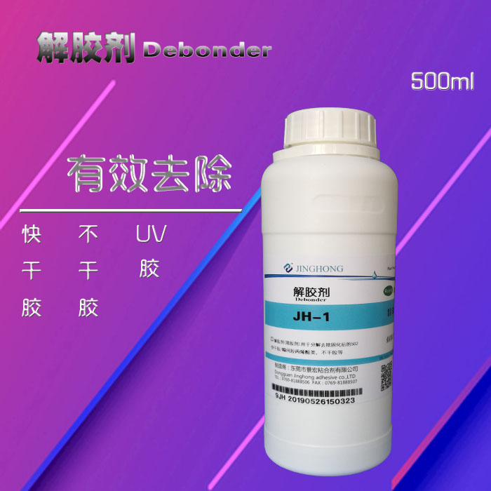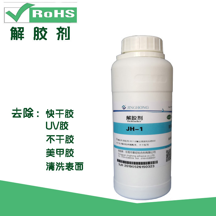 JINGHONG景宏  JH-1解胶剂(除胶剂),是一种合成的化学药剂,能够快速,便捷有效的去除油脂,胶水,及白化等化学成分,起到清洁表面的作用。解胶剂可以溶解各种固化后的胶粘剂,对502401、1203...瞬间胶不干胶,树脂胶,UV胶,指甲油等的清洁效果更佳。