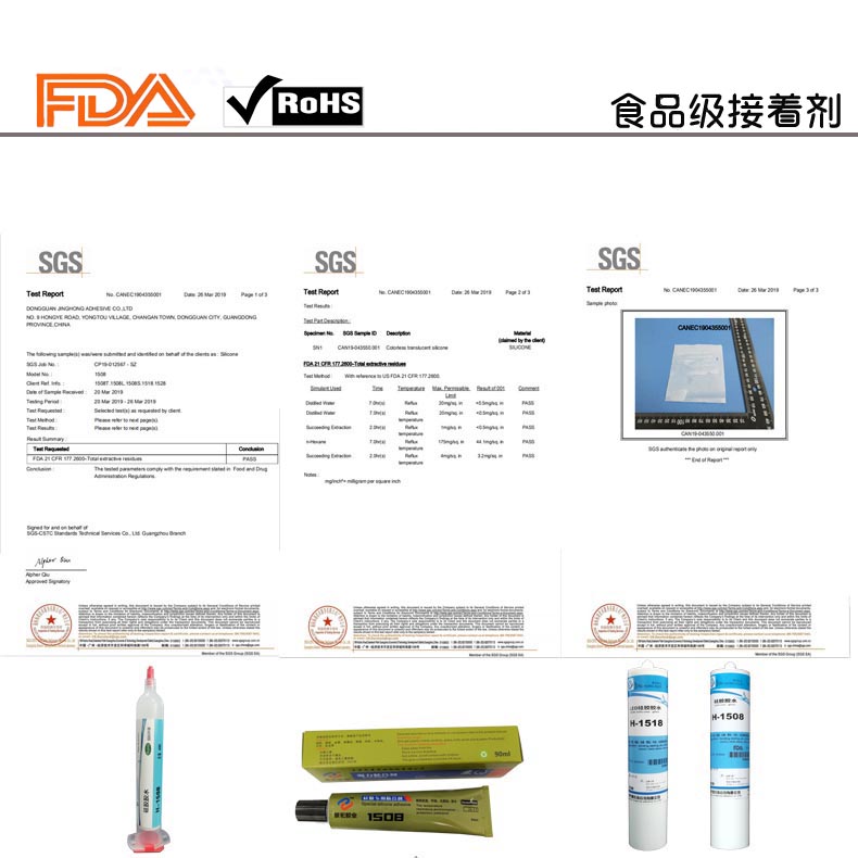 H-1508弹性硅胶胶水广泛应用于电力、电子、电器、仪器、仪表、家用电器、传感器、光学仪器、机械、航空、化工轻工、机械设备、冷冻设备、造船工业、电线、电缆、电加热元器件、建筑、道路、太阳能、工业、教育科研等领域中需要粘合、固定、密封等场合,起到绝缘、防震、防潮、防老化、耐高低温、防水等作用。H-1508弹性硅胶胶水是一种触变型单组分室温固化有机硅胶。胶液固化后为弹性体,具有良好的抗冷热交变性能、耐老化性能和绝缘性能,胶层具有良好的防潮、抗震、耐电晕、抗漏电性能。对金属和塑胶、硅橡胶等材料具有良好的粘接性,无需表面处理,粘接强度可达到硅胶产品的本身强度。食品级FDA+ROHS双认证!
